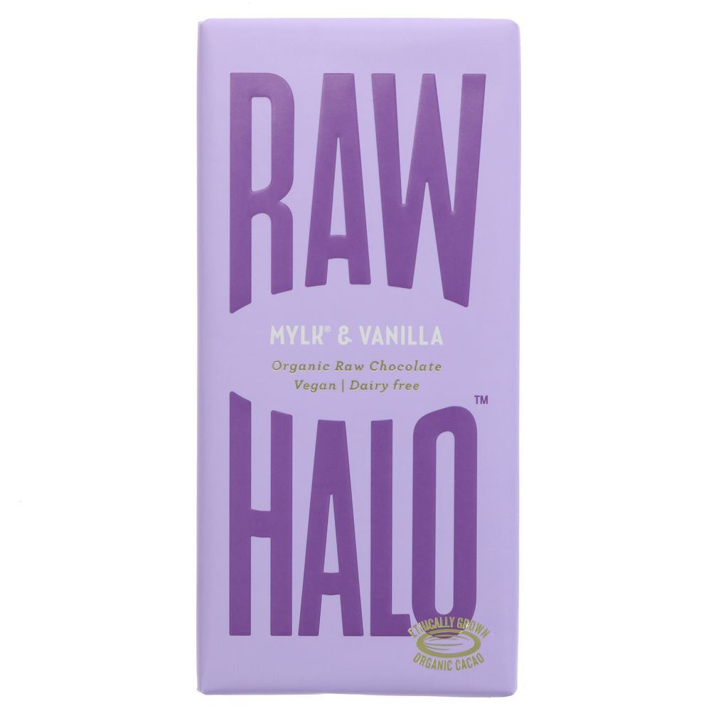 Mylk & Vanilla raises the bar for vegan friendly mylk chocolate. Light up your taste buds with our sophisticated 52% mylk chocolate - it's deliciously creamy and sweet. Made with ethically sourced single origin cacao blended with coconut sugar and creamed coconut. Raw Halo believe chocolate should make you feel good inside and out. That's why they make vegan chocolate bars with organic ingredients and just a touch of coconut sugar. Chocolate with a glossy shine satisfying snap and melt-in-your-mouth smoothness in every single bite. Chocolate that satisfies your mind body and spirit - kind to you kind to the planet. Carefully sourced ingredients from ethically run organic farms and fully recyclable plastic-free packaging. Partnering with OneTreePlanted to plant new trees in the areas they source their ingredients Raw Halo are giving back to the communities that make their chocolate possible. Enjoy chocolate that makes you feel good in every sense. Go on get your glow on. Part of the product range '70g Bars'. This product is Gluten-free, is Organic and is Vegan.