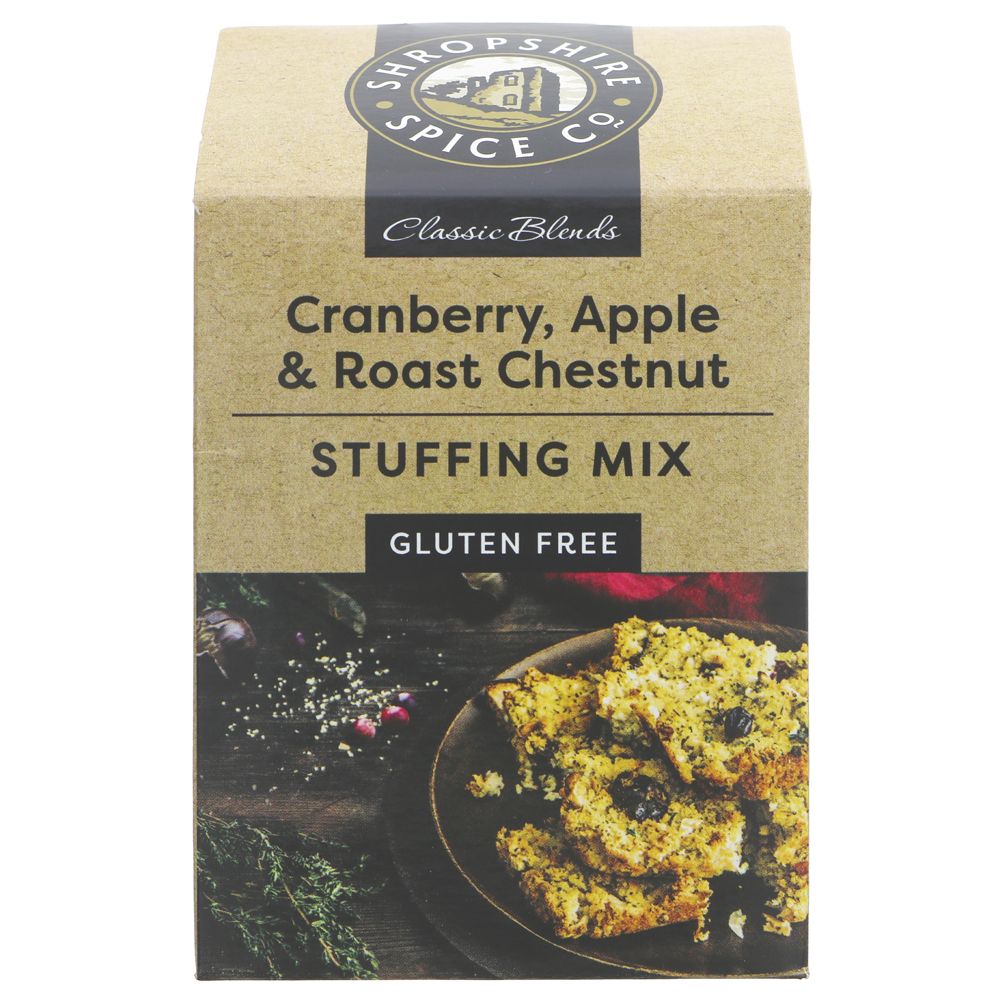 Gluten free breadcrumb (rice flour, maize starch, salt, dextrose), whole cranberries 8.9% (glucose syrup, sunflower oil), red apple 8.9% (preservative: sodium metabisulphite), roasted chestnuts 8.9%, onion flake 2.7%, mixed herbs.